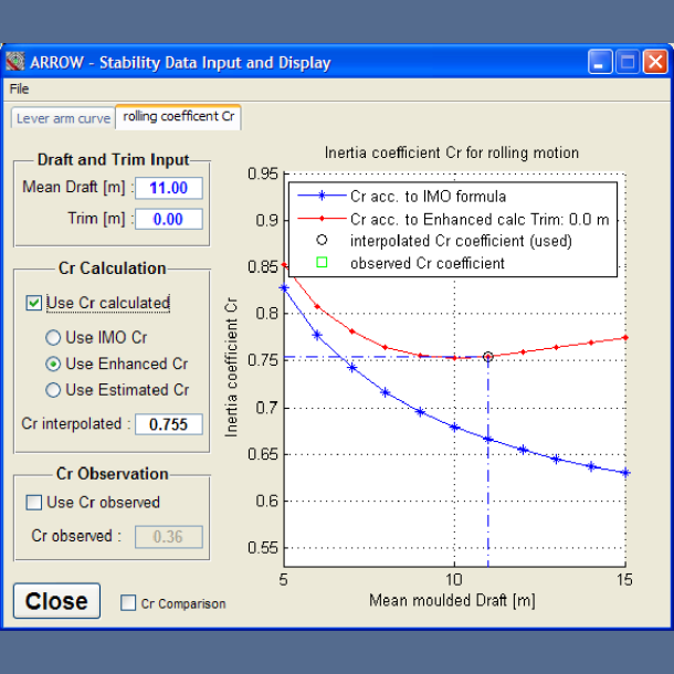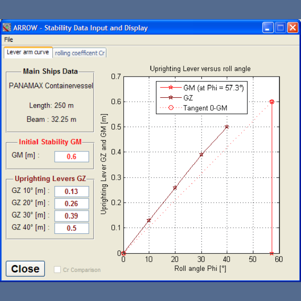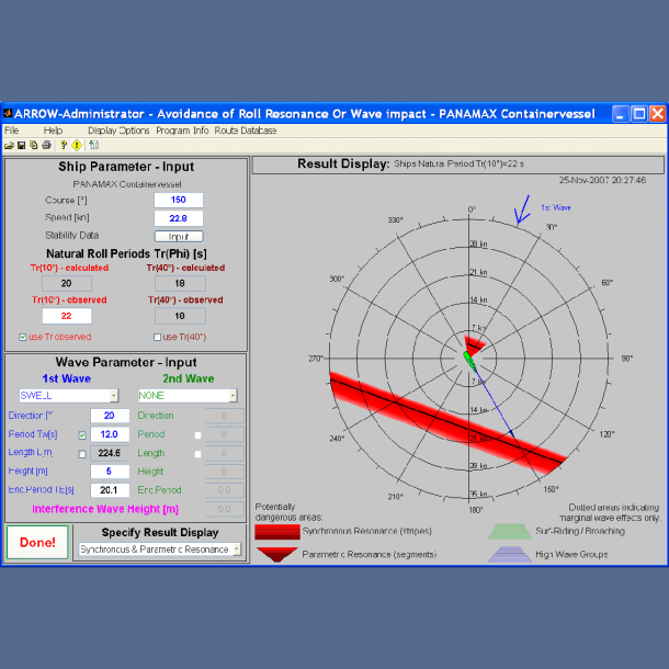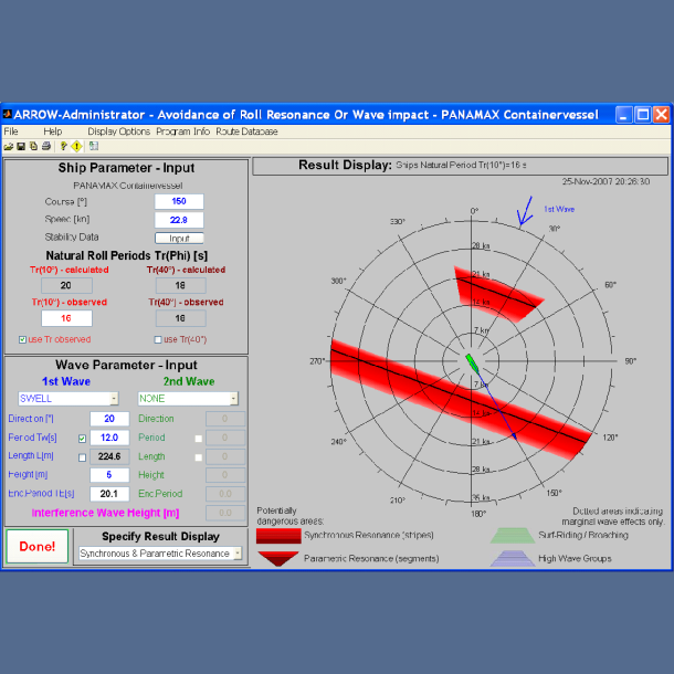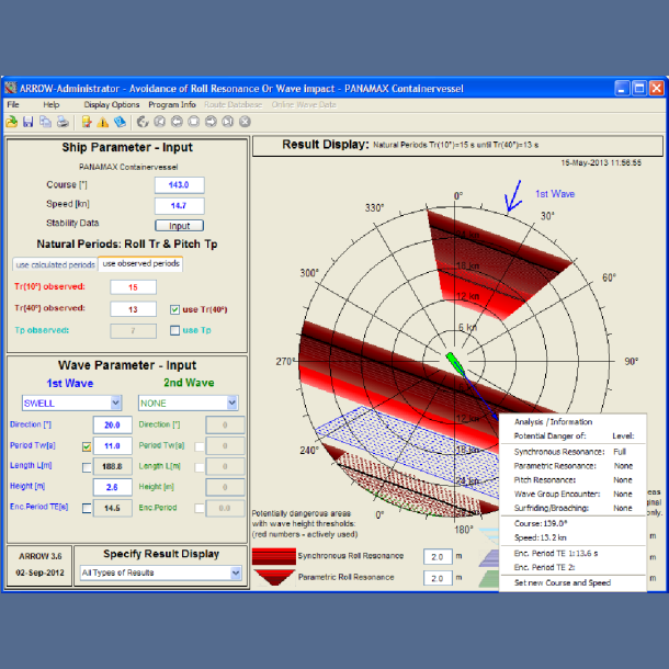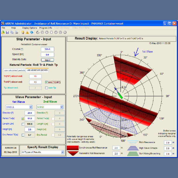 The ARROW program is a software tool to estimate and display the potential conditions and countermeasures to Avoid Rolling Resonances Or Wave impacts on ships due to specific wave encounter situations, specifically potential danger caused by SYNCHRONOUS or PARAMETRIC RESONANCE
