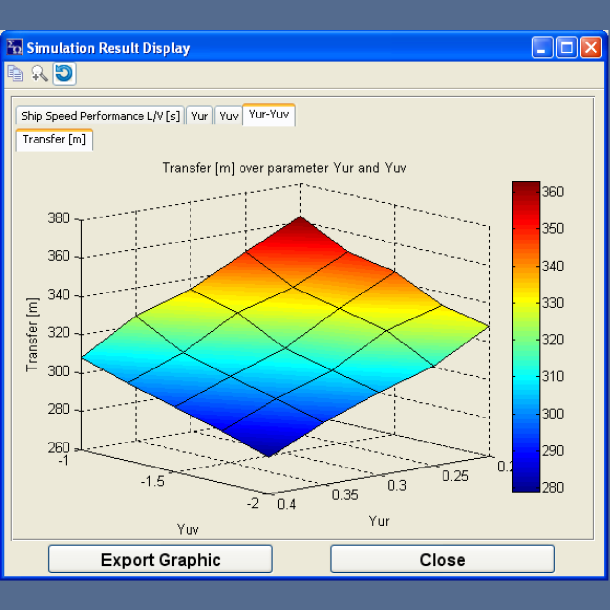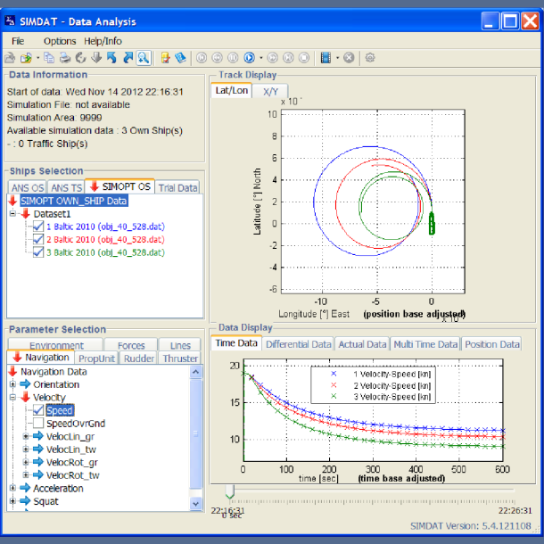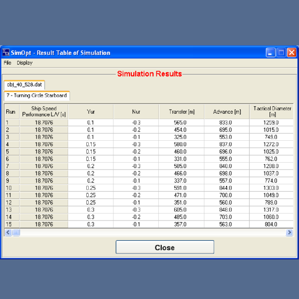 - All results can be efficiently displayed in table or graphic format immediately in SIMOPT or can be exported to be compared with data from other sources (shiphandling simulator recordings or measurement data of manoeuvring trials with real ships using SIMDAT software tool.