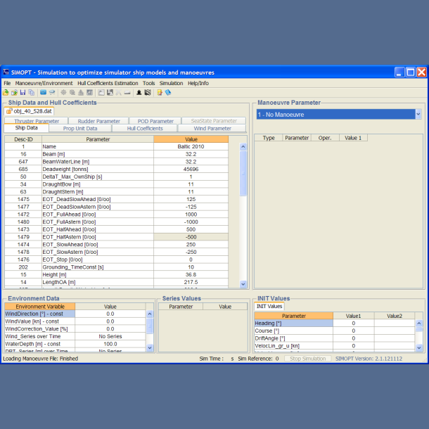 SIMOPT is a software product simulating ship dynamics based on Fast-Time Simulation tech-nology and was developed to support the efficiency of: - tuning processes for estimating ship-model parameters in ship handling simulators and achieve the best fit between real-ship manoeuvring characteristics and the simu-lation ship models used in SAMMON - estimation and optimisation of manoeuvring parameter for specific manoeuvres e.g. emergency turns, Zig-Zag Tests or series for wind impact based on several parame-ters.